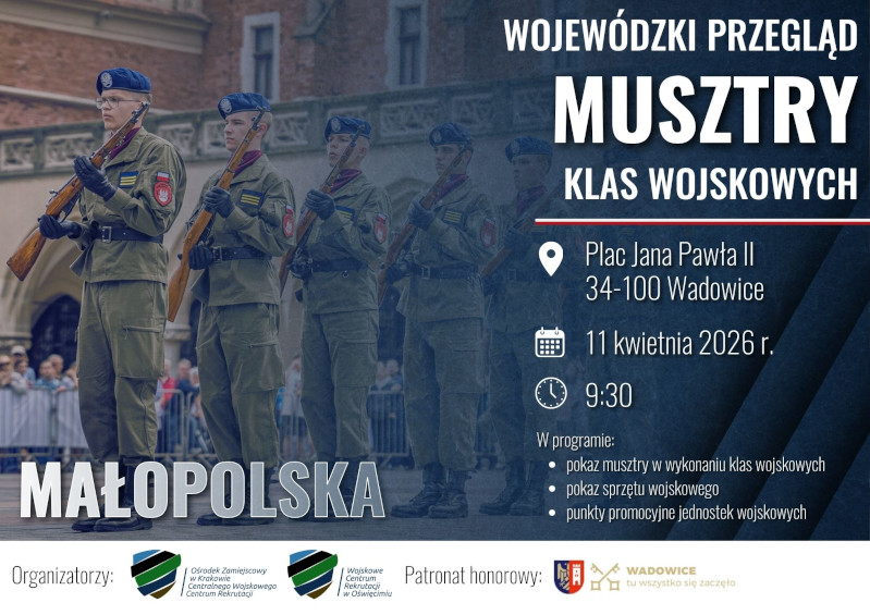 Szanowni Państwo, już 11 kwietnia 2026 r. (tj. sobota) na Wadowickim Rynku odbędzie się XI Wojewódzki Przegląd Musztry Klas Wojskowych! W wydarzeniu udział wezmą...